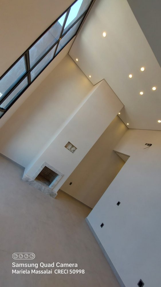 Área de estar com pé direito duplo e lareira