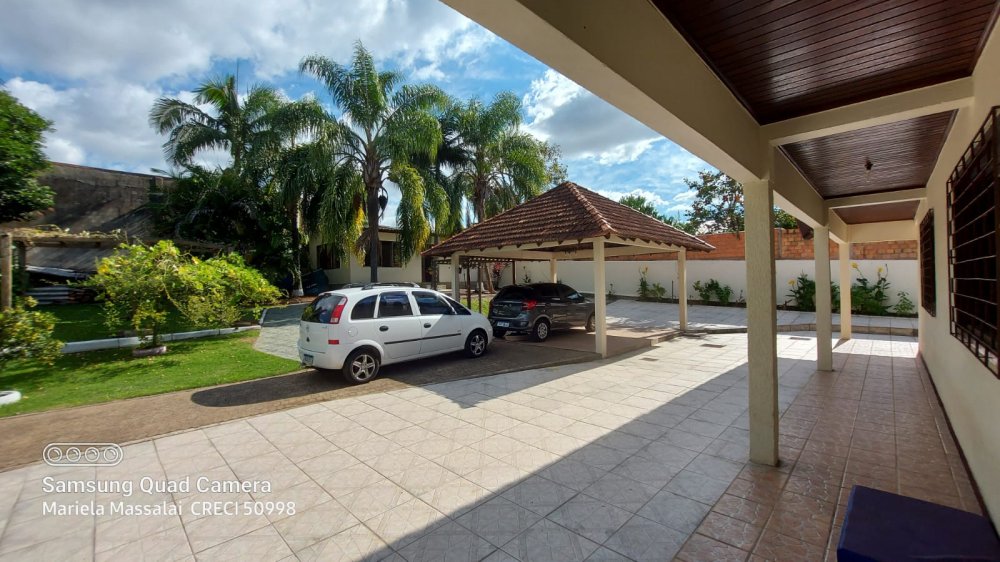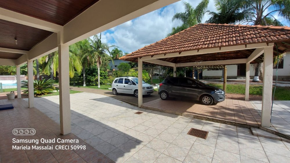 Garagem coberta para dois carros e mais vários carros no pátio.