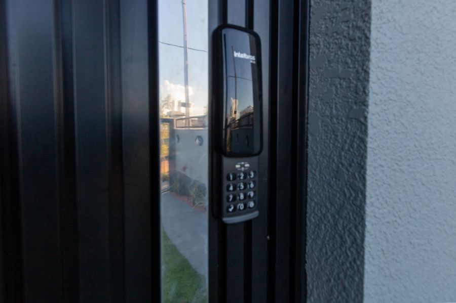 Porta principal pivotante ripada com fechadura eletrônica