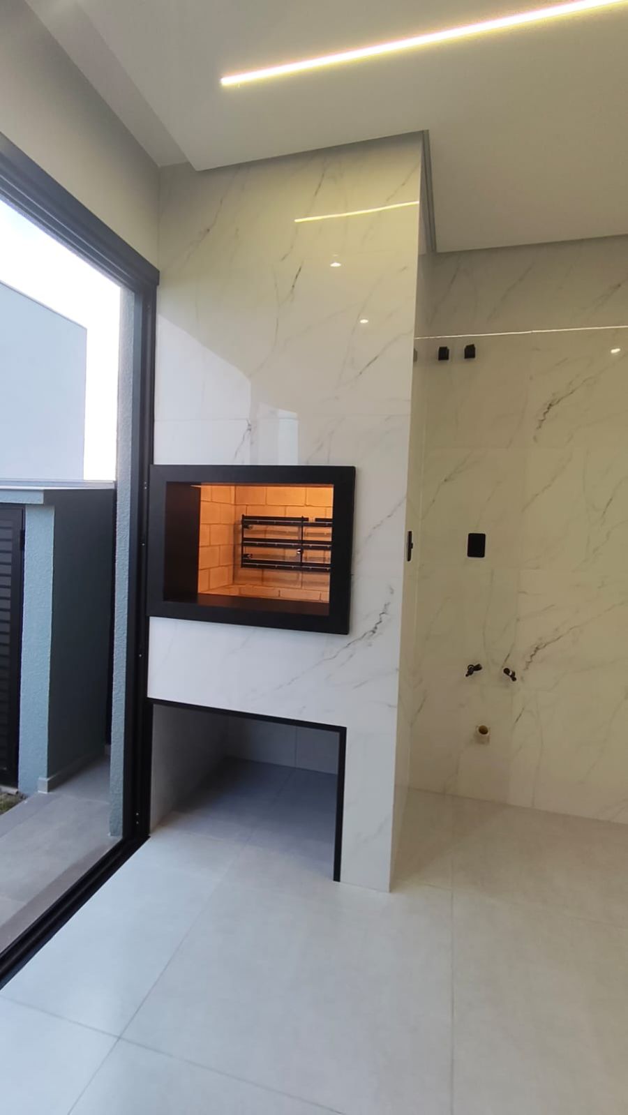 Cozinha gourmet com churrasqueira e iluminação em LED que valoriza cada detalhe