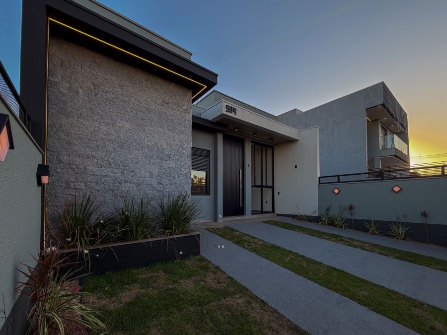 Fachada moderna com pedra natural Miracema e iluminação realçando os detalhes
